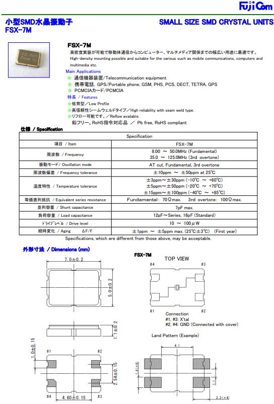 富士通晶振,FSX-7M晶振,SMD晶振,贴片晶振本身体积小,超薄型石英晶体振荡器,特别适用于有目前高速发展的高端电子数码产品,因为晶振本身小型化需求的市场领域,小型,薄型是对应陶瓷振荡器(偏差大)和普通的石英晶体振荡器(偏差小)的中间领域的一种性价比较出色的产品.产品广泛用于笔记本电脑,无线电话,卫星导航SSD,USB,Blu-ray等用途,符合无铅焊接的高温回流焊曲线特性.