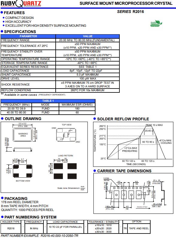 Rubyquartz晶振,R2016晶振,R2016-20.000-10-2050-TR晶振,贴片晶振本身体积小,超薄型石英晶体振荡器,特别适用于有目前高速发展的高端电子数码产品,因为晶振本身小型化需求的市场领域,小型,薄型是对应陶瓷振荡器(偏差大)和普通的石英晶体振荡器(偏差小)的中间领域的一种性价比较出色的产品.产品广泛用于笔记本电脑,无线电话,卫星导航SSD,USB,Blu-ray等用途,符合无铅焊接的高温回流焊曲线特性.