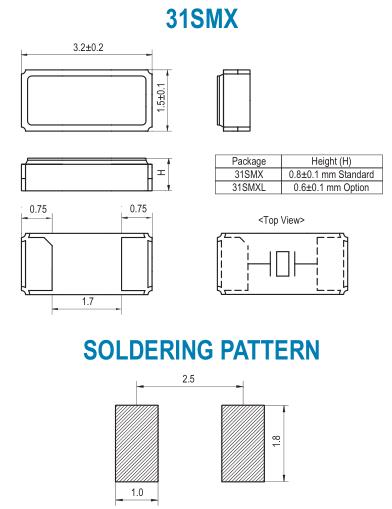 SMI晶振,31SMX晶振,3215mm晶振,32.768K时钟晶体具有小型,薄型,轻型的贴片晶振表面音叉型晶体振荡器,产品具有优良的耐热性,耐环境特性,可发挥晶振优良的电气特性,符合RoHS规定,满足无铅焊接的高温回流温度曲线要求,金属外壳的封装使得产品在封装时能发挥比陶瓷振荡器外壳更好的耐冲击性.