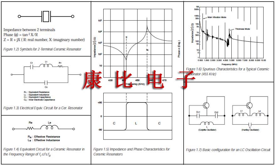 等效电路常数:图1.2显示了陶瓷谐振器的符号.端子间的阻抗和相位特性如图1.5所示.该图说明谐振器在提供最小阻抗的频率fr(谐振频率)和提供最大阻抗的频率fa(反谐振频率)之间的频率范围内变为电感性的.它在其他频率范围内变得具有电容性.这意味着双端谐振器的机械振动可以用等效电路代替,该等电路由串联和并联谐振电路的组合构成,其中包括电感器L,电容器C和电阻器R.在谐振频率附近,等效电路可以表示如图1.4所示.fr和fa频率由压电陶瓷材料及其物理参数决定.等效的循环常数可以从以下公式确定: 考虑到fr<f<fa的有限频率范围,阻抗给定为Z=Re+jwLe(Le<=0),如图1.5所示.陶瓷谐振器应作为具有损耗Re()的电感器Le(H)操作.图1.1表示陶瓷谐振器和石英晶体谐振器之间等效电路常数的比较,注意,电容和Qm存在很大差异,这导致实际操作时振荡条件的差异.附录中的表格显示了每种陶瓷激光器的等效电路常数的标准值.除了期望的振荡模式之外,存在用于其他振荡模式的高次谐波.存在这些其他振荡模式是因为陶瓷谐振器使用机械??共振.图1.6显示了这些特征.